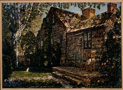 "These works are really indicative of the breadth of the Guild Hall collection, comments Jerry Bloomer, secretary-treasurer of the board of R.W. Norton Art Foundation. Bloomer adds "You'll see a painting by Thomas Moran, who settled there with his family in 1884. He was one of the Hudson River School artists who trekked out to the east end by the 1870s. American Impressionist Childe Hassam followed, likely aboard the newly established Long Island Railroad from New York City." (left: Thomas Moran (1837-1926), A Midsummer Day, East Hampton, Long Island, 1903, Oil on canvas/board. 13 1/3 x 19 1/2 inches. Purchase through the Guild Hall Art Acquisition Fund, 92.27 The popular two-volume Picturesque America, published 1872-1874, included the following passage in its chapter Scenes on Eastern Long Island: "Perhaps no town in America retains so nearly the primitive habits, tastes and ideas of our forefathers as East Hampton." Thomas Moran captures the spirit of an idealized neo-colonial landscape in A Mid-Summer Day, East Hampton. Moran, along with other landscape artists of the day, sought creative inspiration in pastoral locales like East Hampton not only in response to the French Barbizon School, but to satisfy a prevailing cultural yearning for a simpler, unspoiled vision of America at a time when society wrestled with the often unsettling changes wrought by the industrial age.)