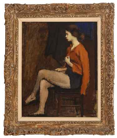 (above: Raphael Soyer (1899-1987), The Dancer, late 1940s, Oil on canvas, 19 1/2 x 15 3/4 inches. Gift of Mrs. Charles S. Dewey Jr., 65.1 Image courtesy of Guild Hall, East Hampton, N.Y. The family of Raphael Soyer moved to New York City from Russia in 1912. He attended free classes at Cooper Union and the National Academy of Design. Guy Pène du Bois, with whom Soyer studied at The Art Students League, introduced him to gallery dealer Charles Daniel. Through Daniel, Soyer's first solo exhibition was mounted in 1929. As a social realist, his numerous portrait paintings, including many self-portraits, offered unglamorous, often stark glimpses of the "common man." Soyer's genre paintings of city life, his depiction of bus passengers, shop girls and the unemployed capture the urban mood of New York in the nineteen thirties and forties. He summered in Southampton from 1949 to 1954, and again in 1980.)