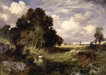After World War II arrived the Surrealists, then the Abstract Expressionists, such as Jackson Pollock, Roy Lichtenstein, Willem de Kooning, and Andy Warhol. The philanthropist, Gerald Murphy, who befriended Ernest Hemingway and other "Lost Generation" writers and artists in Europe, welcomed many to his East End home. (left Thomas Moran (1837-1926), A Midsummer Day, East Hampton, Long Island, 1903, Oil on canvas/board. 13 1/3 x 19 1/2 inches. Purchase through the Guild Hall Art Acquisition Fund, 92.27. Image courtesy of Guild Hall, East Hampton, N.Y. The popular two-volume Picturesque America, published 1872-1874, included the following passage in its chapter Scenes on Eastern Long Island: "Perhaps no town in America retains so nearly the primitive habits, tastes and ideas of our forefathers as East Hampton." Thomas Moran captures the spirit of an idealized neo-colonial landscape in A Mid-Summer Day, East Hampton. Moran, along with other landscape artists of the day, sought creative inspiration in pastoral locales like East Hampton not only in response to the French Barbizon School, but to satisfy a prevailing cultural yearning for a simpler, unspoiled vision of America at a time when society wrestled with the often unsettling changes wrought by the industrial age.)
