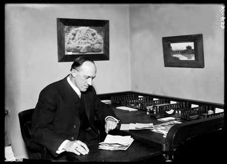 Hewett developed the idea of building a new art museum and realized that to do so he had to enlist the counsel of an individual with an art background. After meeting Robert Henri in 1914 in San Diego, Hewett believed he had found the person to help him realize the new museum. By this time Henri was firmly established in the New York art world as a renowned artist, progressive teacher, and modern art advocate. He was a powerful force in turning young American painters away from academic art to the rich subject-matter of modern urban life. In Henri, Hewlett saw a powerful ally in raising the community's cultural profile and hoped that he would attract other artists of similar reputation and ability from the East. In the spring of 1916, work began on the building, the design of which was heavily inspired by the early 17th-century San Estevan del Rey Mission Church. Henri lent his expertise in establishing the institutional mission, philosophy, programming, and look of the new galleries. Henri also organized the inaugural exhibition at the new facility when it opened in 1917. (right: Edgar L. Hewitt in his office, Palace of the Governors, Santa Fe, New Mexico circa 1910. Photo by Jesse Nusbaum. Courtesy Palace of the Governors Photo Archives (NMHM/DCA), Negative 7383.)