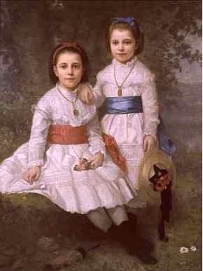 on the elder girl's shoulder. Their crisp white dresses and golden lockets