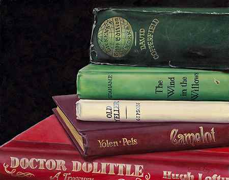 Other artists of the exhibit also bring fascinating and fresh eyes to the world of still lifes. Soon Warren, a native of South Korea and resident of Fort Worth, renders her works in oil on canvas. Her favorite subjects are fruit and flowers from her garden. "I'm inspired by the beauty and complexity of nature and our surroundings. I try to paint the essence of the subjects and my sincere feelings for nature," she remarks. Ms. Warren is a signature member of the National Watercolor Society, the Southern Watercolor Society, and the Texas Watercolor Society. (left: Camille Engel, Chilhood Classics, Oil on panel)