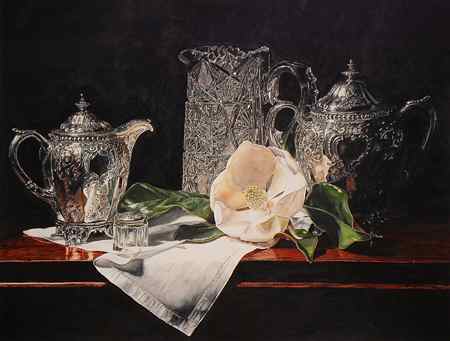 Laurin McCracken, Silver, Crystal and Magnolia on Linen, Watercolor)