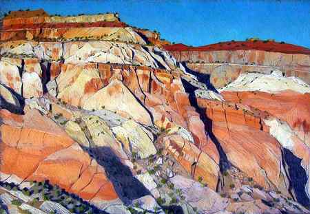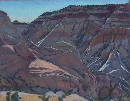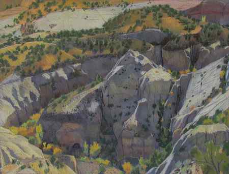While some plein-air, or outdoor, painters begin their works outdoors and then finish painting in the studio, Mitchell begins and finishes each painting outside, despite the challenging cycle of the seasons. In spring, howling winds can fill the sky with dust and June is home to clouds of Cedar Gnats that can make leaving the safety of one's car or home a mistake. Yet, it is balanced by summer days filled with aromas of sage, fern bush and cliff rose.
