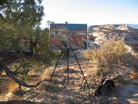 The sublime and stimulating environment that pastel artist Scotty Mitchell calls home is the Colorado Plateau, in particular in southern Utah, a captivating region now protected as the Grand Staircase-Escalante National Monument. Throughout the cycle of the seasons it presents challenges for the artist who works outdoors, en plein aire, as Mitchell does. In spring howling winds can fill the sky with dust and during June it is home to clouds of Cedar Gnats that can make leaving the safety of one's car or home a move of desperation. Yet summer days bring the aromas of sage, fern bush and cliff rose. Autumn skies offer calm, clarity and warm light, and winter months can be frigid, although the light is crystalline and colors are intense.
