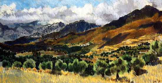 Before moving to Boulder, Utah in 1997 Mitchell lived and painted on Crete for more than twenty years. She had sought a home where she could paint outdoors year round, and familiar with the Mediterranean region from her college years, she moved to Crete. Initially, she lived in the small mountain village of Spili near the center of the island for three years. She then moved to Gerani on the northwestern coast. Her pastel Distant Selia (1990) reveals that her emphasis on color, and the abstract nature of landforms was well developed by that time. Exhibiting the same rich color and structural abstraction as Maynard Dixon, comparison with his paintings is common, though Mitchell was unfamiliar with Dixon's work before her move to Utah. She acknowledges the influence on her work from Henri, Pierre Bonnard, Wolf Kahn, and Dorothy Andrews, another American painter living on Crete at the same time as Mitchell.