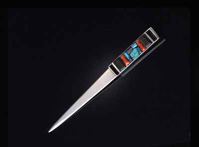 Loloma also made quick sketches as simple references for his jewelry designs. These were hurriedly drawn and often contained notations as to which stones to incorporate and the positions of the stones. The jewelry drawings shown in this exhibit are at times associated with the exact items of jewelry made from them, while at other times similar examples of jewelry have been paired with the drawings. (left: Charles Loloma (Hopi, 1921-1991), Letter opener, 1959, turquoise, coral, wood, silver. Bequest of Edward Jacobson, 4411-2)