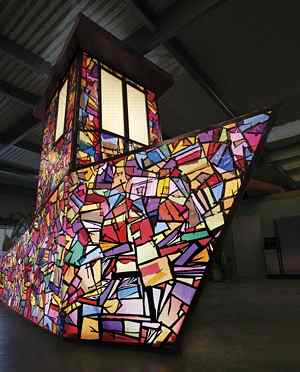 But with their monumental work, Puccinelli and Goodman have committed themselves. The Boat is a declaration albeit a goofy one. Made of a simple, scrapped-together wood framework, designed and engineered on the fly, and covered in translucent panes comprising sheet plastic, layered-up colored cellophane, and black tape, all illuminated from within, The Boat is a ship that one cannot pass unknowingly in the dark. Its endlessly hued skin -- a Pantone burlesque of camouflage looking like some kind of surface design collaboration between Piet Mondrian, Franz Kline, Roy Lichtenstein, and a comic book inker -- suggests a structure of nothing but graphic stained-glass windows, while its "windows" are cartoonish glowing blanks. It is luminous. It is an illumination. The work turns the conventional experience of stained-glass luminosity inside out, with the light normally perceived from the interior of a church or cathedral now emanating from an architectural object like a lantern. The church becomes boat. The boat becomes lighthouse. The lighthouse casts off from its perch. The sculpture becomes stand-in for vehicle, beacon, and sanctuary all in one. It might be a ship of fools, and might even be kin to Diogenes' roving lantern, but all foolery and cynicism aside, the tugging optimism of Goodman and Puccinelli's monument is an irresistible force.