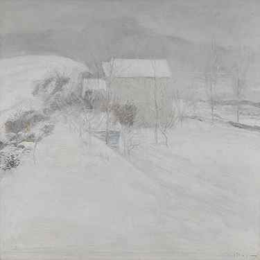"Painters at the time depicted what was near and familiar to them, which also happened to be really modern at the time," said Glisson. For example, Snow, by John Henry Twachtman (1853-1902), shows the artist's backyard covered in snow. Twachtman, a member of the new suburban class, lived in southern Connecticut close to the railroad so he could commute into New York City whenever he needed. Though not a farmer, he lavished care on his suburban yard. (left: John Henry Twachtman (1853-1902), Snow, ca. 1895-96, oil on canvas, 30 x 30 inches. Pennsylvania Academy of the Fine Arts, Philadelphia, The Vivian O. and Meyer P. Potamkin Collection, bequest of Vivian O. Potamkin.)