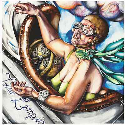 Amelia Earhart -- who never crashes. The painting marks Brigham's journey