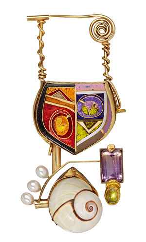(above: William Harper (born 1944), Labyrinth, 1984. Gold, silver, cloisonné enamel on copper, fine silver, amethyst, tourmaline, pearl, and snail shell, 3 3/4 x 1 1/2 x 3/4 inches. Collection of the Enamel Arts Foundation, gift of the McLeod Family Foundation/Jairo Ramirez.)