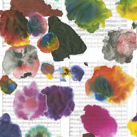 lithography on music score pages on canvas, approximately 13 x 34 feet,