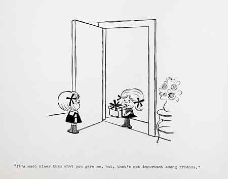 Getsler made hundreds of these gags that were published around the world, but her heart was in the wit and innocence of children. This exhibit focuses on her beautifully drawn gags of kids -- kids who want to understand grown-ups but maybe never be one, kids who are wise beyond their years but constantly befuddled by the strange rituals of adulthood. "Although I treasure the memory of my mother telling me that I was sometimes her inspiration for these gags, the truth is that her own independent thinking and incredible wit made this work her most successful series," says Cohen.
