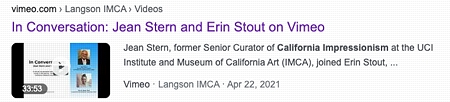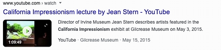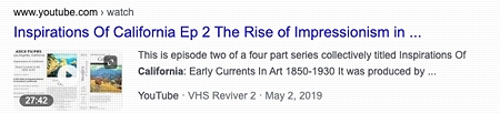 The Wildling Museum says: "This landmark public television series, produced by KOCE TV Foundation in 1996, documents the story of California art from statehood in 1850 to the beginning of the Depression in 1930. The narration, illustrated by original works of art from many California museums, features interviews with respected art historians, Bill Gerdts, Wanda Corn, Harvey Jones, and Jean Stern among others. Each program lasts 28 minutes.