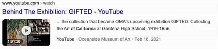 Visiting...With Huell Howser #726 - GARDENA ART is a 28 minute 1999 video by Huell Howser Productions. "Beginning in 1919, the graduating classes of Gardena High School bestowed gifts of paintings upon their beloved school. This program lasted until 1956, and amassed more than 90 works. Soon after the program ended, many of the paintings were stored away and forgotten about. Along with several Gardena High School Alumni, Huell visits the Irvine Museum to see an exhibit of 31 fully-restored paintings from this important collection." Text courtesy of Huell Howser Productions.