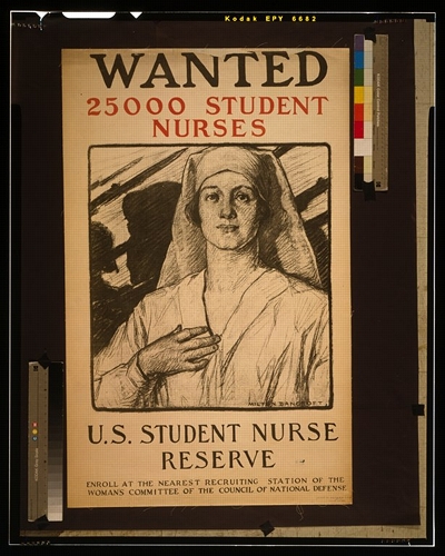 (above: M.H. Bancroft, Poster, Wanted 25,000 student nurses, U.S. Student Nurse Reserve, c. 1917, colored lithograph, 103 x 64 cm, Library of Congress. Public domain, via Wikimedia Commons*)