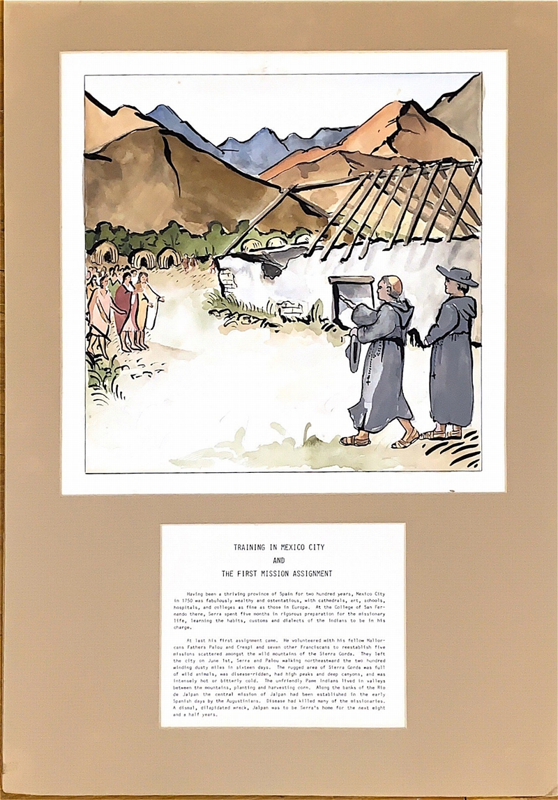The illustrations were designed as a graphic historic depiction of the life of Saint Junipero Serra, depicting his childhood in Mallorca, Spain and his emigration to California. Louisa Cooper researched the history of J. Serra both locally and in Mallorca to reveal a rich story of the little-known part of his life prior to the founding of the California Missions. The narrative history accompanying the watercolor illustrations was written by Ms. Cooper in 1981 and is based on her research studies.
