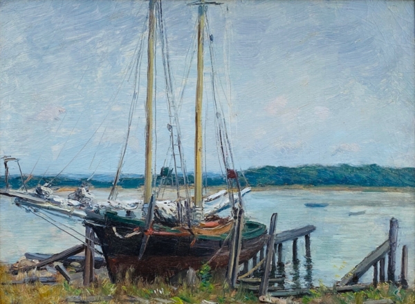 (above: Clark Voorhees, Schooner, Noank, Connecticut, oil on board, 12 x 16 inches, The Cooley Gallery, Old Lyme, Connecticut. Public domain, via Wikimedia Commons*)