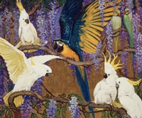 A Fanciful World: Jessie Arms Botke is a 2021 exhibit at the Laguna Art Museum which says: "Bold, decorative studies of exotic birds and flowers are the subject of Jessie Arms Botke's most notable paintings. After settling in California, Botke reached her stylistic peak in the 1930s with eye-dazzling artworks adorned with gold and silver leaf, inspired by Japanese design and European landscape aesthetics. Despite her prolific output and successful career, few exhibitions have focused solely on Botke's work. This exhibition examines work from different periods of Botke's career and travels including a magnificent 29-foot-long mural that once adorned the Oaks Hotel in Ojai, California." Also see LA Weekly 12/22/21 coverage. (left: Jessie Arms Botke, Macaw and Cockatoos, 1926, oil on board, The Irvine Museum Collection at the University of California, Irvine, UCI IMCA, Irvine Museum) Accessed 1/22
