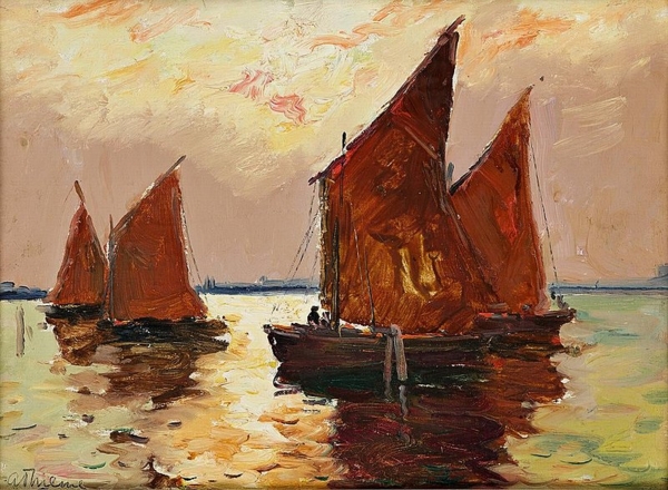 (above: Anthony Thieme, Venetian Waters (Sailboats at Sunset), c. 1930, oil on canvas, 12.25 x 16 inches, Liveauctioneers.com. Public domain, via Wikimedia Commons*)