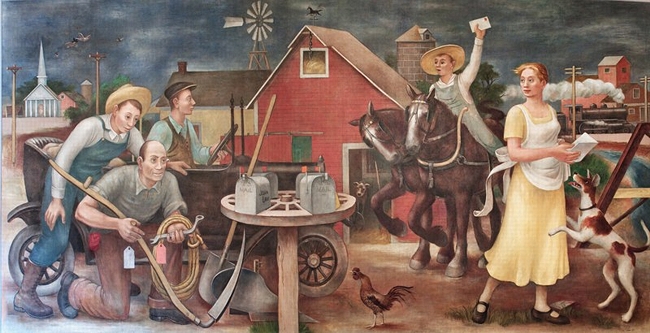 (above: Doris Lee, Country Post, 1938, mural, 6' x 13' 6", Ariel Rios Federal Building, Washington, D.C. Photographs in the Carol M. Highsmith Archive, Library of Congress, Prints and Photographs Division. Public domain, via Wikimedia Commons*)