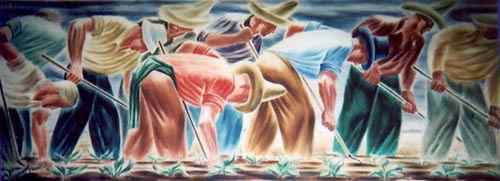 (above: George Samerjan, Lettuce Workers, Calexico, CA Post Office, 1942, tempera. Treasury Department Section of Painting and Sculpture)