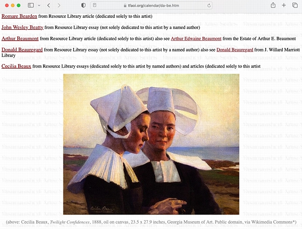 Following is an image of a part of an America's Distinguished Artists page with a .jpg image of a Ceclia Beaux painting with an accompanying label.