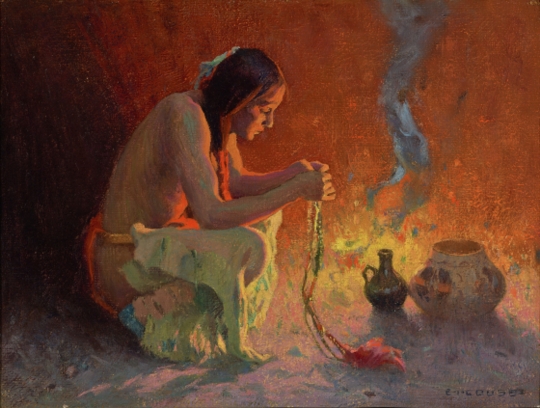 (above: E. Irving Couse, Crouching Indian by a Fire, c. 1910, oil on canvas; 11 3/8 x 15 3/8 inches, Denver Art Museum, Funds from 1986 Collectors' Choice, 1986.8)