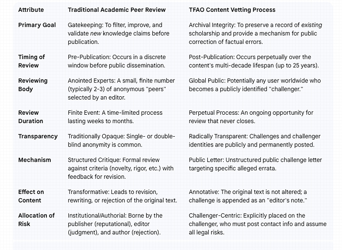 This fitness for purpose is also a direct reflection of the underlying economic and risk models of each domain. Academic journals, whether commercial or society-run, treat their reputation as a primary asset, often measured by metrics like the Journal Impact Factor https://en.wikipedia.org/wiki/Impact_factor . Publishing flawed or fraudulent research poses a significant reputational and financial risk. Consequently, they invest heavily in the costly, labor-intensive, pre-publication system of peer review as a form of risk mitigation. TFAO, as a non-profit digital archive, faces a different set of risks, primarily related to copyright infringement and liability for factual inaccuracies within its vast collection. Its vetting model is therefore economically efficient: it outsources the labor of error-checking to its global user base and mitigates its legal risk by shifting liability directly onto the challengers. Each system is a rational adaptation to the economic and legal realities of its specific operational context.