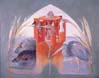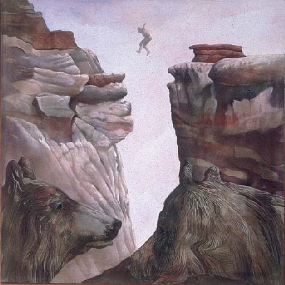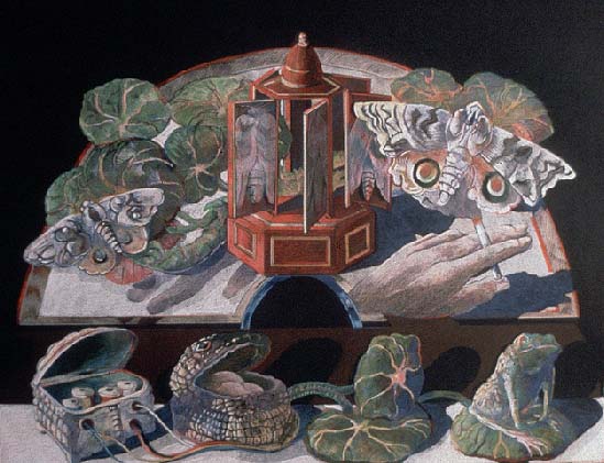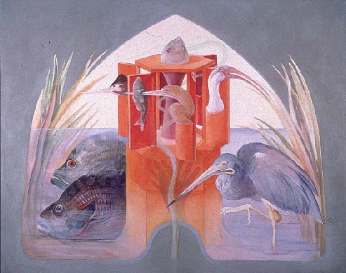 The titles of her works offer clues to their metaphoric content. In Endangered (1982), Lanyon warns against allowing precious things to fade into memory. Pictured across the long, scroll-like canvas are several seemingly disparate images: a delicate Chinese vase; a bird attempting to fly off of the paper on which it is drawn; a postcard of a railroad depot; and a fish jumping out of polluted water. In Tamiami (1977), she pairs familiar curios with scenes from nature to evoke thoughts about their relationship to one another. Set against a landscape, two cockatoos hover above porcelain parrots that seem to gaze up longingly at their feathered counterparts. Though her works are cautionary, they are not void of humor. Her visual pun Hermit Crab (1976) provides clever commentary on present-day suburbia, as the familiar crustacean is pictured with a split-level house on its back in place of a standard shell.