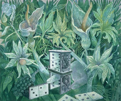 Dominoes and Dragons, 1999, acrylic on canvas, 44 x 52 inches)