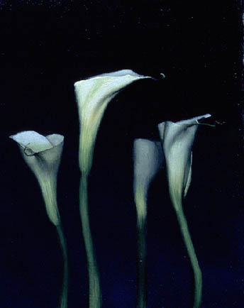 Images from top to bottom (click on thumbnail images to enlarge them): Calla Lily #2, 1998, oil on Masonite, private collection; You Should Live Like Flowers, 1998, oil on Masonite, collection of Dr, Robert and Yvette Keyser.