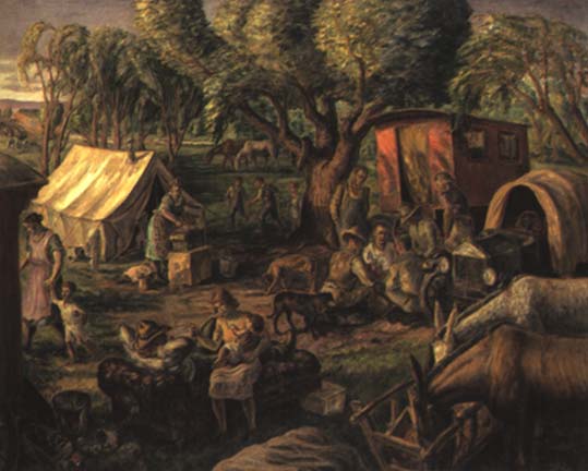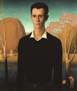 From top to bottom: Thomas Hart Benton, Lonesome Road, 1927, tempera on masonite, 25 x 34 inches; Ogden Fleissner, Morning Mass, 1928, oil on canvas, 42 x 54 inches; O. Louis Guglielmi, Phoenix, 1935, oil on canvas, 30 x 25 inches; Grant Wood, Arnold Comes of Age, 1930, oil on board, 26 3/4 x 23 inches; John Steuart Curry, Roadmenders' Camp, 1929, oil on canvas, 40 1/4 x 52 1/4 inches; Louis Bouche, McSorley's, 1940, oil on canvas, 41 x 50 inches.