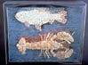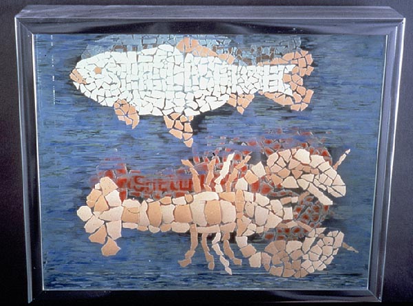 The titles of his Mindscapes almost always incorporate the word "egg." For example, there is an "Eggsect Colleggtion" of six insects, an "Eggyptian" sphinx, and a snowy landscape during a "Nor'eggster." When asked the age-old question "Which came first?", he explained that sometimes he thinks of an image and the title follows, and other times a title or egg-word will occur to him first. (left: Shell-fish, 1997, acrylic, eggshell, mirror, 7 1/2 x 9 1/2 x 3 inches)