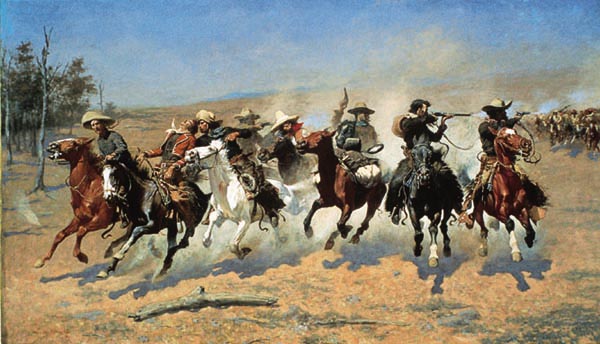 The recognizable "A Dash for the Timber" launched Remington's career as a major painter when it was exhibited at the National Academy in 1889. The detail in the horses - nostrils flaring, every muscled strained to its limits - makes them almost burst from the canvas.
