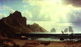 Just beginning his professional career and obviously eager to make an impression at the National Academy exhibition of which he had become an Honorary Member that year, Bierstadt created a highly ambitious and complex composition. Multiple points of focus, from the carefully detailed genre scenes in the foreground to the distant, mist-enshrouded rocks, are unified through strong lighting and an emphatic perspective construction. Along the mountains at the left, color and atmosphere are evenly graded to create a gradual recession into space. In the water this transition is more abrupt, especially at the extreme right where perspective is foreshortened and the dark foreground rocks are poetically echoed by the eccentric formations in the distance. The center of the composition is commanded by a strip of dazzling reflections, despite the fact that this involves an overhead light source inconsistent with the long shadows on the beach. A lone sailboat, suspended in mist and light becomes the main focal point of the picture and summarizes its romantic mood. Although Bierstadt may have been familiar with earlier American paintings of Italian views, a close parallel being The Isle of Capri, 1848, by Jasper F. Cropsey, he is primarily indebted to the Dusseldorf landscape tradition as established by Johann Wilhelm Schirmer and the brothers Achenbach for his crisp technique and concern for detail.