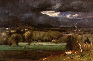The subject of the coming storm, a popular one in 19th century romantic painting, appears more than two dozen times in Inness's oeuvre over a thirty-year period. Unlike many of his contemporaries who chose to portray untamed wilderness, George Inness, like the French Barbizon painters, preferred an intimate, domesticated or, in his words, a "civilized" landscape.