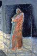 In her evolution from ceramic work to oil paint, Mary Frank retained her extraordinary ability to draw, her sensitivity to texture and her interest in tonality and color. Her use of color is a primary component of her emotive and evocative work, and she has chosen an expressionistic association of warm and cool hues. Her orange-red is reminiscent of early Italian Renaissance masters; she frequently juxtaposes it with a vivid blue to produce striking results. In Mary Frank's hands, white and black take on the richness of blended and layered pigment.