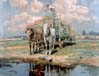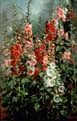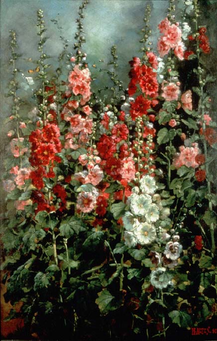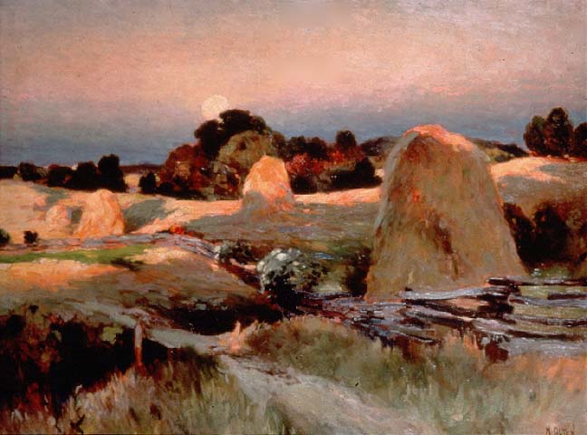 Above from top to bottom: Pintor, 1921, collection of George and Barbara Gordon; Sunset on the Farm, Saugatauk, MI,1913, private collection; Hollyhocks, 1897, collection of Blodgett Butterworth Health Care Foundation; Rancho de Taos, 1927, collection of George and Barbara Gordon; The Last Load, c. 1935, The Grand Rapids Art Museum, Museum Purchase with funds provided by John and Marilyn Drake