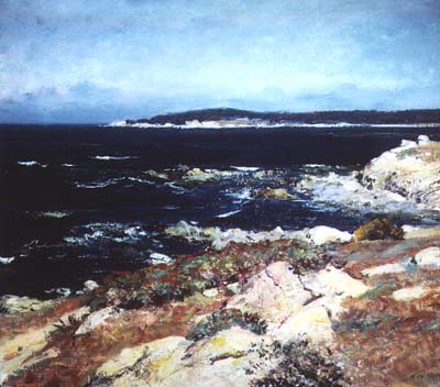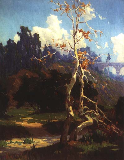 Among the twenty-two artists in the exhibition are Edgar Payne, William Wendt, Marion Kavanagh Wachtel, Maurice Braun, and Guy Rose. Most of these painters were from other areas of the country, but they were drawn to the outstanding beauty and infinite variety of Californian geography - the deserts, mountains, foothills, canyons, forests, valleys, seashores, and islands. The impressionist style is concerned with the effects of natural light on the landscapes and the atmosphere created by varying conditions of weather. Bold brush strokes of contrasting bright colors were used to create those effects. The artists also painted "en plein air," a unique style where the scene is captured on canvas in the environment, instead of creating a study and taking it back to the studio to finish.