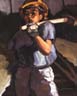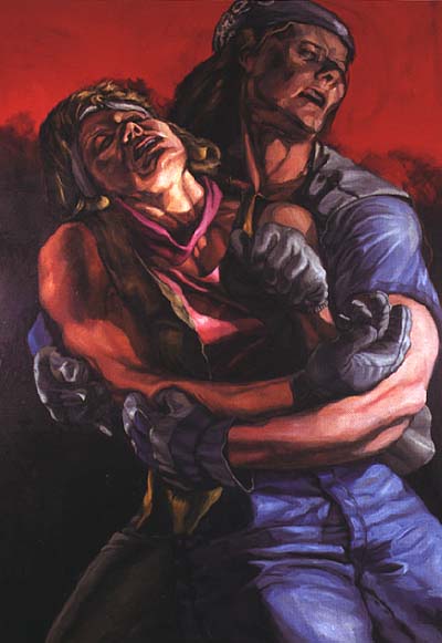 Even the limited spaces that are present to clarify the contextual relationships of the figures and their actions, are themselves animated as if in response to the activity depicted. In the third place, Priest does not linger over details. He subordinates details in favor of the broad forms or so successfully sweeps them out of sight into the ever-pressing rhythms of the composition that we don't even miss them. In the end, the tensions and dramatic effects of limbs, torsos and incidentals of setting bound together into tightly closed configurations are fortified by a strong contrasts of color and of light and dark. (right: Two Track Repair Women, 70 x 96 inches, 1999)