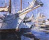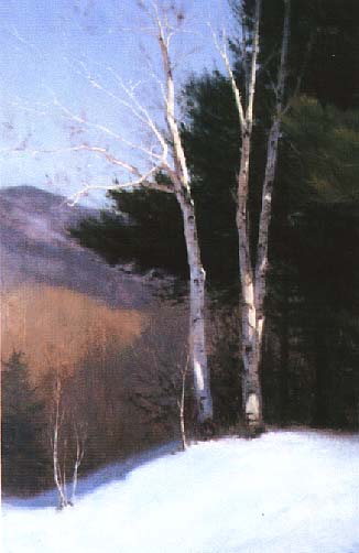 This first annual "Impressions of New England" exhibit and sale was juried by the Art Center, with artists from around the country submitting their work. The show is a competition, with award money being offered for the top honors. Over eighty pieces are included in the show, with subjects including sugar houses, maritime work, covered bridges and fall foliage. Artists participating in the show include those who have shown at the Center before as well as artists from surrounding areas who heard of the show from art leagues and magazines. "We do have artists from as far away as California and Arizona, but most of the exhibiting artists are from the Northeast," says Elizabeth Small, curator. "Some of the Plein Air Painters who were here for last year's show submitted work that was completed during their stay in Bennington, so we also have quite a few local scenes, including ones of the monument and our covered bridges." (left: John Swatsley, Coastal Schooners, oil; right: Timothy Thies, Winter Birch, oil)