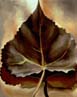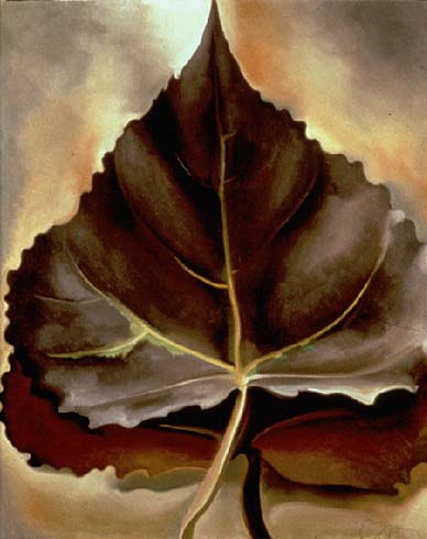 And so it was in the 1920s that O'Keeffe established herself principally as a painter of recognizable forms, for which she remains best known today. She developed approaches to representation during this decade that reveal her ongoing fascination with Modernist photography. Her large-scale paintings of flowers, leaves, and trees frequently present close-up views of these natural forms, and many of her paintings of New York buildings use optical distortions that are equally derivative of photographic manipulations. (left: Grey and Brown Leaves, 1929, oil on canvas, MAM, Gift of the Georgia O'Keeffe Foundation)