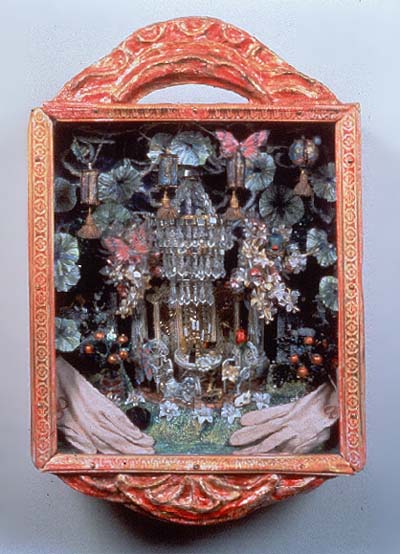 The aesthetic and creative freedom which the box gives to an artist is one of the reasons why art in boxes can be so successful. Boxes can be decorated inside and out, in the form of a diptych with a hinged center, a frame for intriguing stop action scenes, or filled with historic, nostalgic, and personal material.(left: Deborah Fisher, New Skin with Accessories, 1999, mixed media, 2.5 x 10 x 12.75 inches)