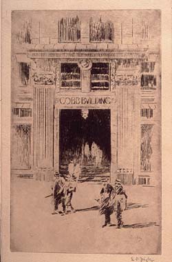Ziegler, Cobb Building, 1934, drypoint on Christmas card, 7.75 x