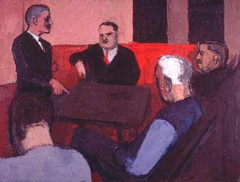 Nearly 100 prints, drawings arid paintings spanning more than fifty years of work will be on view from March 16 through April 21, 2002. The San Francisco native, who is generating considerable admiration and attention from a new generation of printmakers, was associated with the artists' group founded by the late Charles Griffin Farr; he studied printmaking with Dick Graf, Gordon Cook, Max Beckmann and Rupert Garcia and shared a studio with James Weeks. Before WWII, Wolff studied at the California School of Fine Arts, and later received B.A. and M.A. degrees from UC Berkeley. (left: Alger Hiss and Whitaker Chambers, circa 1950s, oil on canvas, 36 x 46 inches, Collection of Louis Girling)