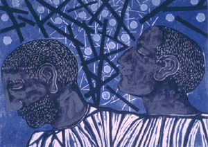 (right: Emmaus, 1983, color woodcut, 16 3/4 x 22 inches,