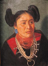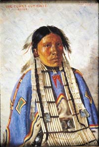 The exhibition will also include a rich survey of American Indians from all areas of the West -- from Montana to New Mexico and from Missouri to California. Burbank's portraits have appeal due to their variety, visual integrity, and psychological sensitivity. The portraits not only give ample evidence of Burbank's capabilities as a draughtsman and colorist, but they also give evidence of the humanity of their subjects. The exhibition will present the portraits in the context of the reservation environment in which they were produced, as well as descriptions of their culture and how the subjects were presenting themselves. (left: She Comes Out First - Sioux)