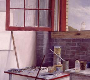 Questions abound. Change directions and wrestle with the image to find its place in the mind's eye. The wall-easel, made of wood, has a panel on it. The table-palette nudges this panel like a springboard or quay. His painting is the timetable into this illusion.