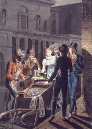 The watercolor Nightlife in Philadelphia - an Oyster Barrow in Front of the Chestnut Street Theatre (1811 ca. 1813) documents a quick evening repast enjoyed by three dandies out for the evening. The food vendor's cart -- a wheelbarrow full of oysters -- has a shelf and a ledge for plates, condiments, utensils, and a lantern. The stand is staffed by a black man, shown shucking an oyster, and a white woman, who holds a plate at the ready in one hand while the candle in her other hand illuminates the scene.